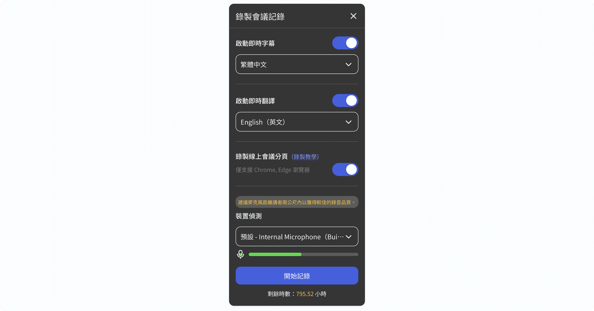 If your meeting involves multiple languages, you can display translated subtitles at the same time—for example, converting Chinese speech into English subtitles. Simply activate the real-time translation feature and choose the output languages you need. - Select your audio input device
