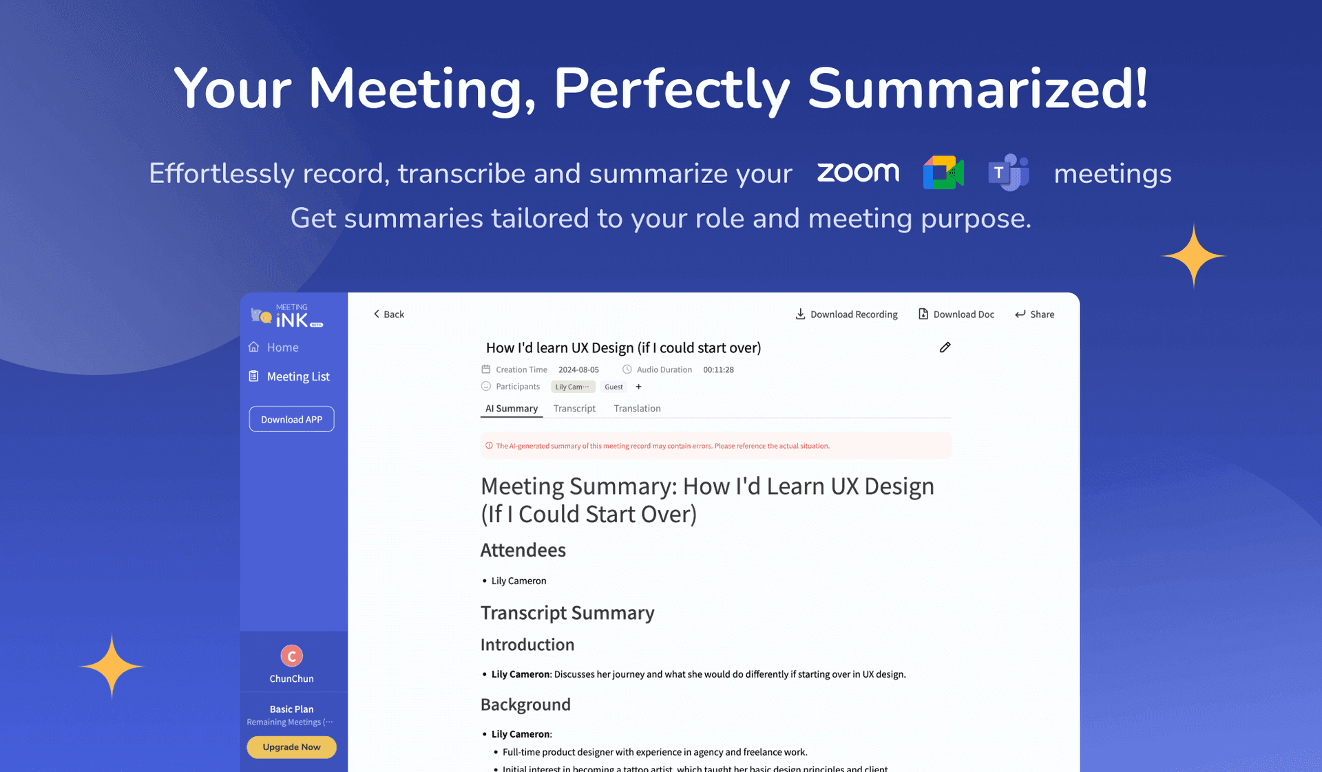 Meeting Ink offers a variety of subscription plans designed to meet the needs of different users. From the free trial version to premium enterprise solutions, these plans cater to a wide range of users—from individual creators to large corporations. The free version is ideal for users who want to experiment with AI-driven summarization, offering up to five meeting recordings per month, each lasting up to 30 minutes. This allows users to experience the core features of Meeting Ink without any financial commitment. Additionally, all subscription plans provide dual service through both the app and web versions.