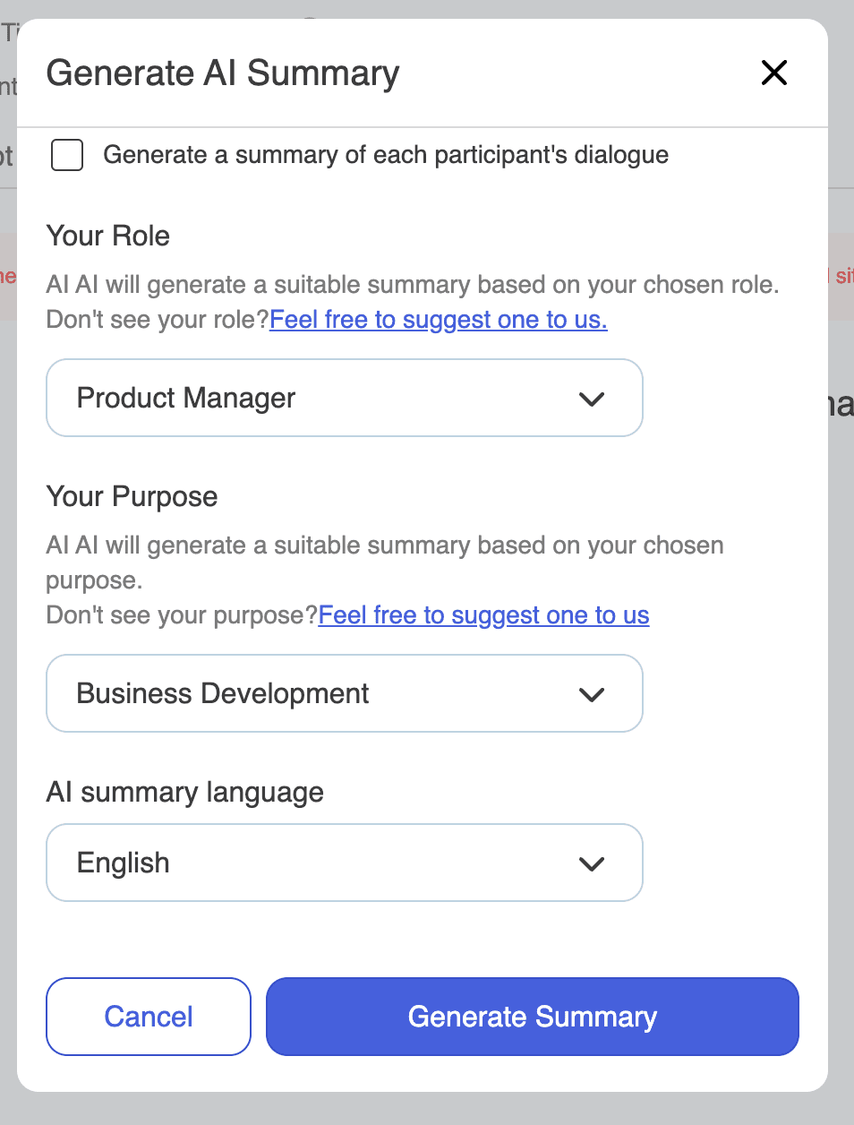- Role-Based Custom Summaries: Users can select their roles from a predefined list, and the system will generate summaries tailored to the needs of those roles, ensuring each participant receives the most relevant information. Supported roles include: