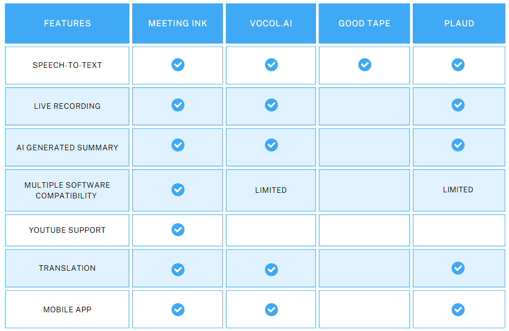September 20, 2024In today’s fast-paced remote work environment, managing meeting minutes, discussions, and taking notes can quickly become overwhelming. With many AI meeting assistant tools available, users are seeking the most user-friendly and efficient service. In this comparison, we’ll explore several popular options—Meeting Ink, Vocol.ai, Good Tape, and Plaud—to help you find the best solution for handling transcription, note-taking, and generating meeting summaries. By examining their features, strengths, and limitations, you'll be able to choose the tool that best suits your needs.