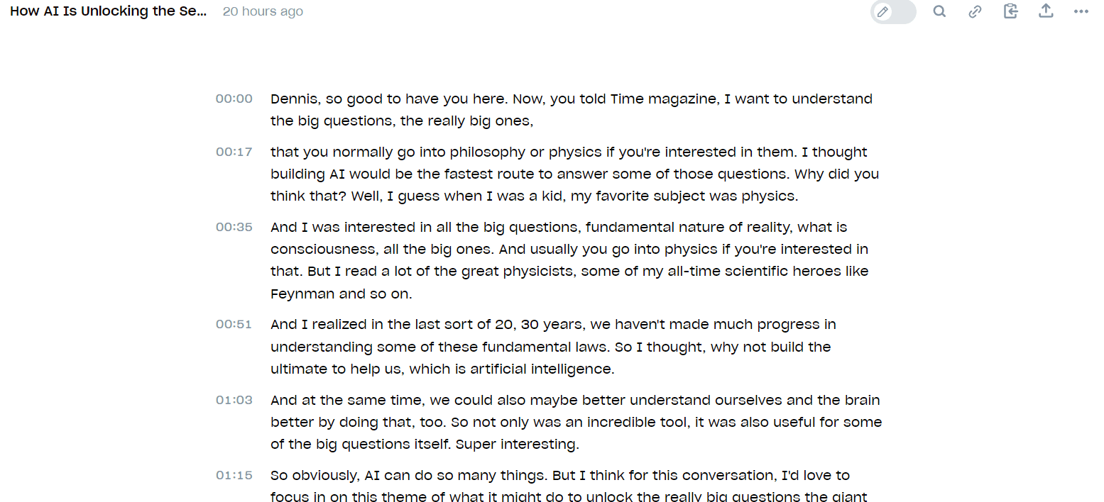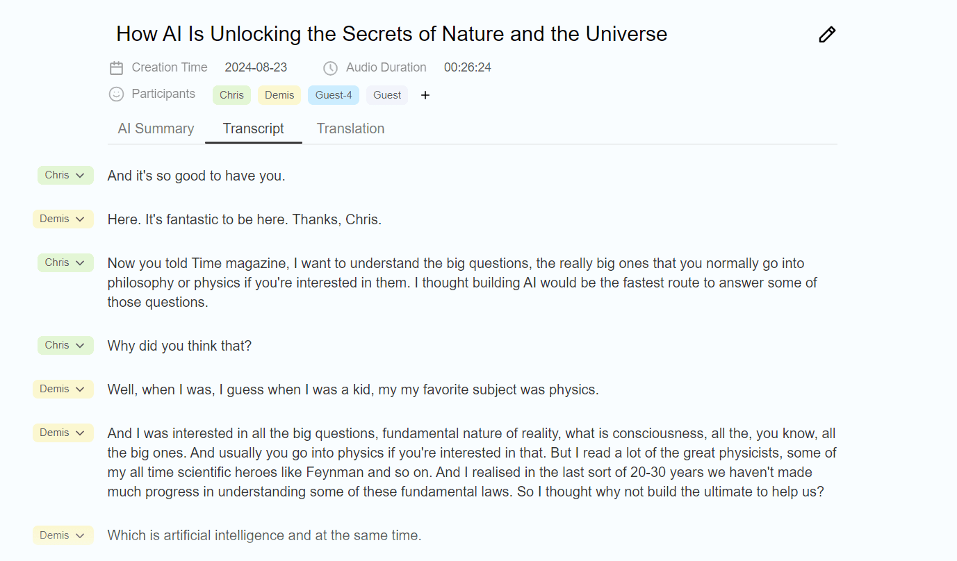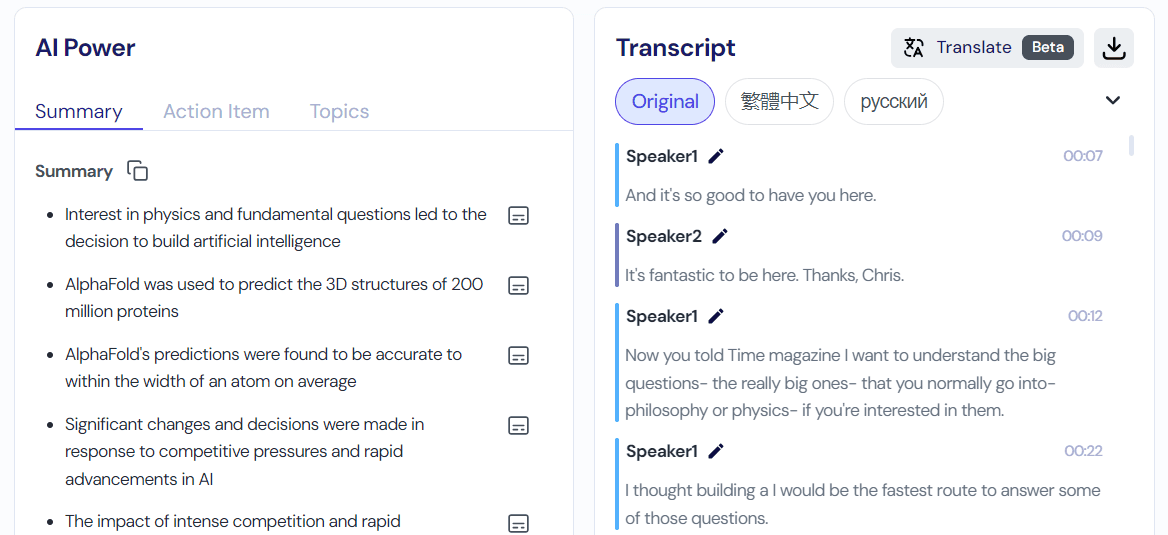 The platform accurately captures speech in multiple languages, including English, Chinese, and Japanese. The transcripts are speaker-differentiated, editable, and can be downloaded.