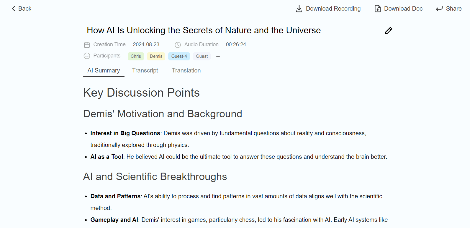 - Speaker-based – Extract key points from a specific speaker. This is particularly useful in multi-participant lectures where you only need insights from a particular lecturer.