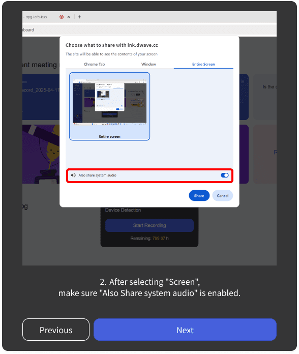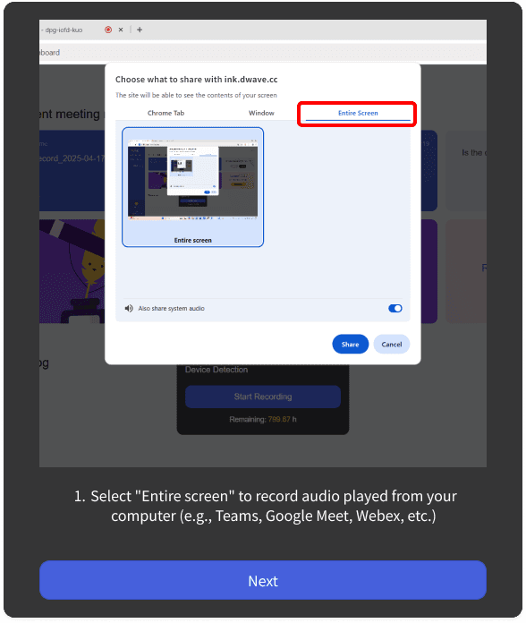 1️⃣ Choose “Entire Screen” when sharing your screen
