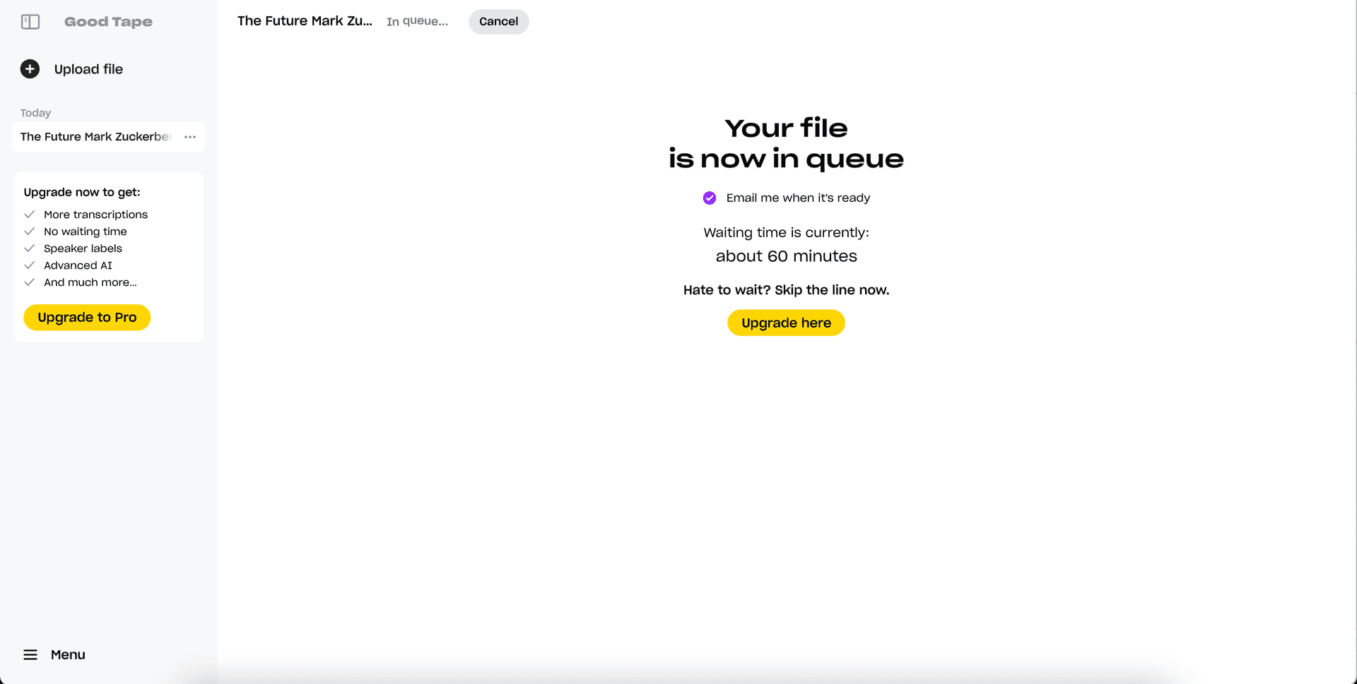 Good Tape provides basic transcription services, but its free plans have clear limitations in both summarization and processing speed. If you’re on a tight deadline, check whether they meet your workflow needs.