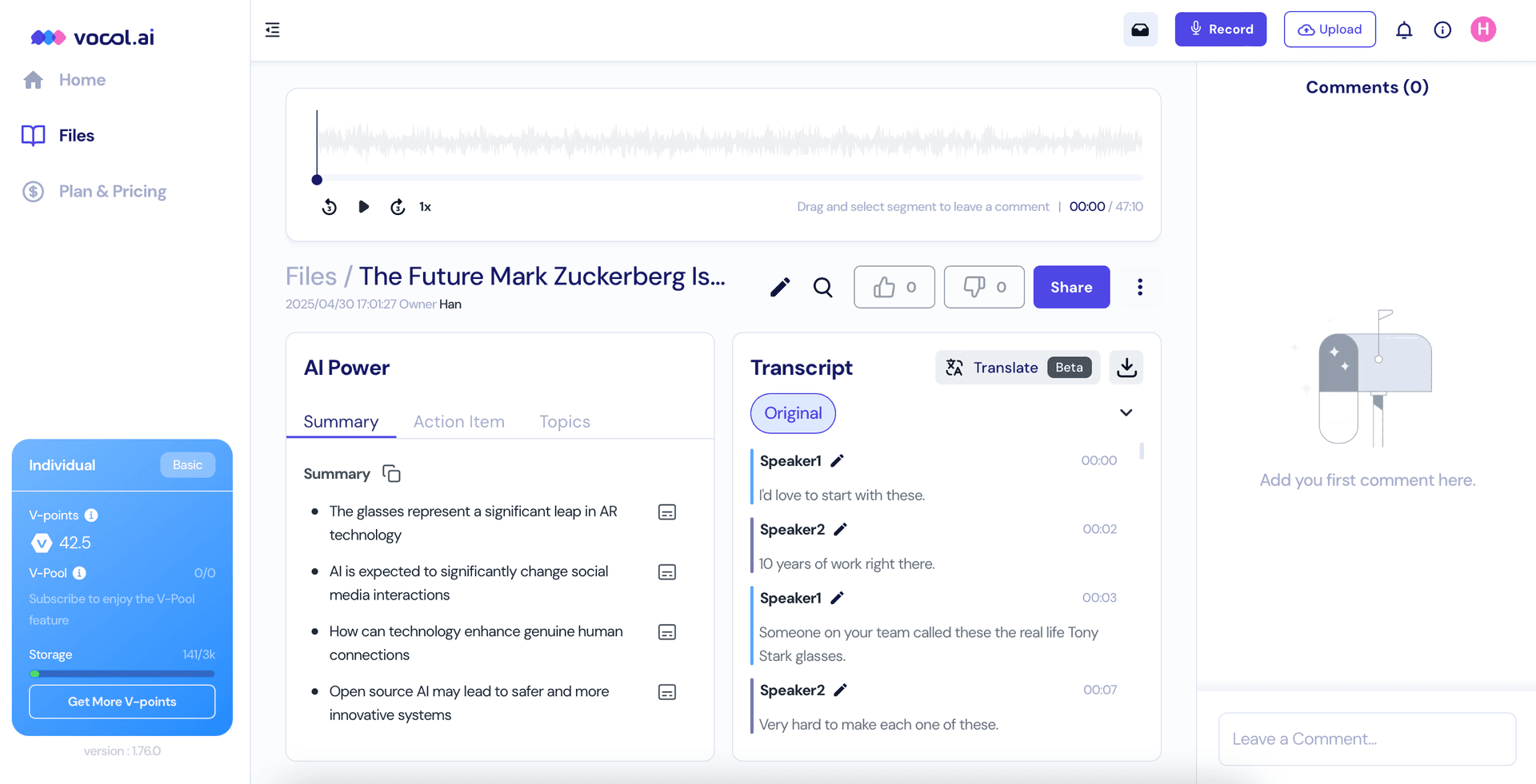📌 Vocal.ai | Better Suited for Post-Meeting Recap and Organization