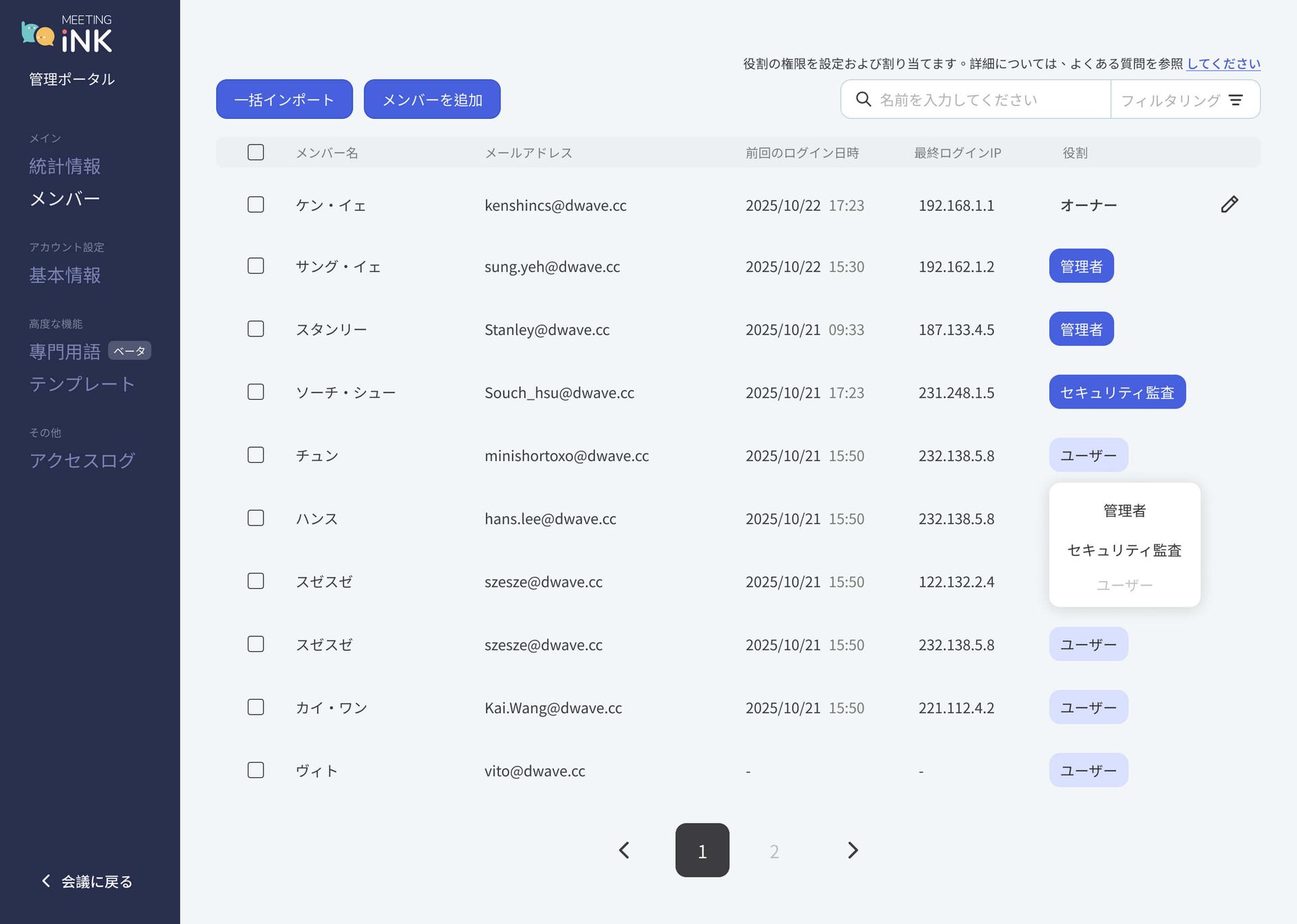 会議データは部署や役割、時には国境をまたいで流通します。そこで鍵になるのが「誰が見られるか/誰が編集できるか/誰が共有できるか」。どれだけ優秀な文字起こしや要約があっても、ルールが曖昧だとコントロールは失われがちです。企業ロール設定は、ロール × 権限 × 共有ポリシーで Meeting Ink を「ツール」からガバナブルで監査可能な協業基盤へ引き上げます。