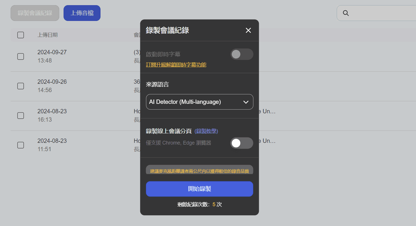 - 麥克風錄音或手機錄音: 直接錄下線下或面對面課程。只需使用裝置的麥克風來錄製課程內容即可,盡量確保錄音品質能得到更好的轉錄成果。