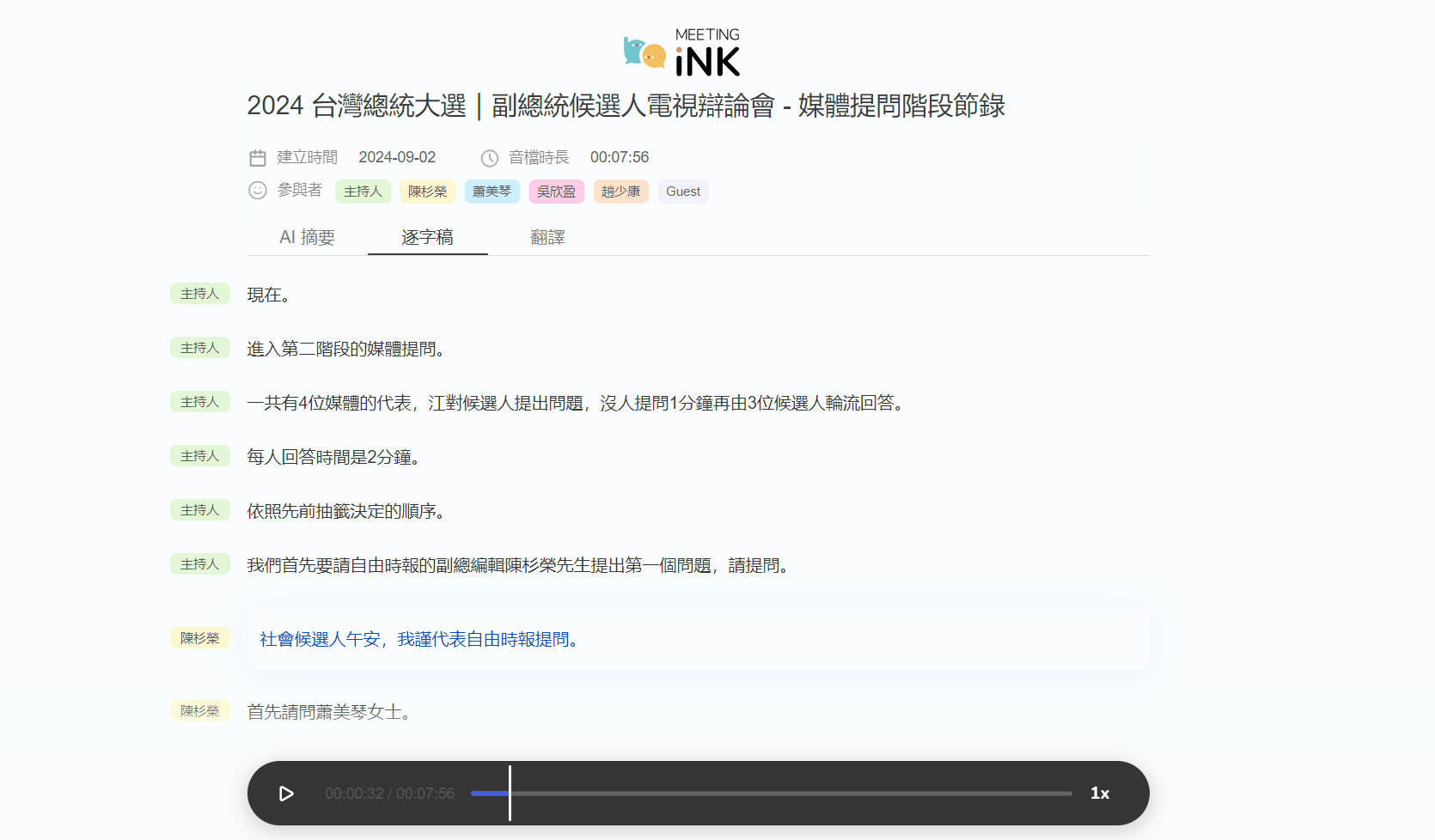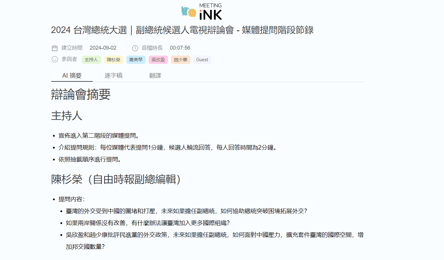 - 基於發言者 —— 從特定發言者中提取關鍵資訊。這對於多位參與者或交流講座特別有用,當只需要特定講者的見解時,也能快速的提取並摘要。