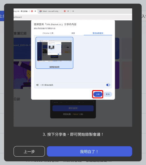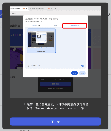 我們很開心宣布:現在只要使用 Windows 的 Chrome 或 Edge 瀏覽器,就可以透過 Meeting Ink 錄製整台電腦播放出來的聲音!