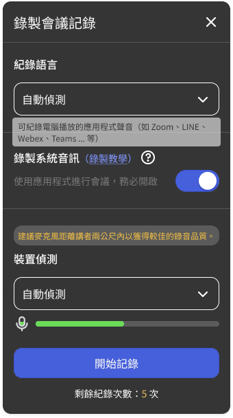 用 Zoom、Google Meet、Webex 開會,不再擔心聽不到「系統聲音」的片段,像是簡報中的影片講解、音效展示、背景配樂,都能同步被錄下來。